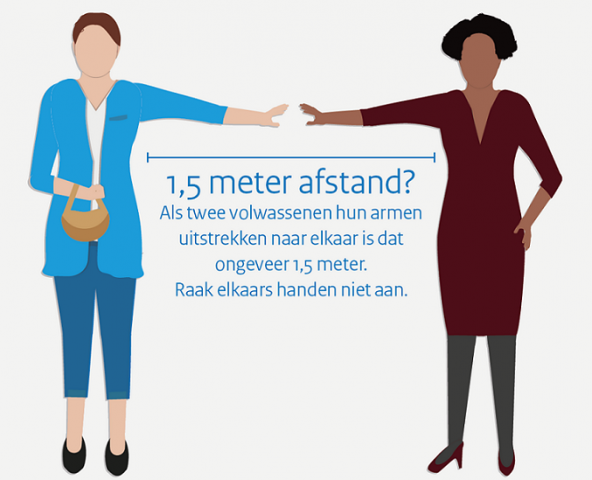 1. Zet tafeltjes 1,5 meter uit elkaar en plaats indien mogelijk plexiglas schotten tussen de tafeltjes.